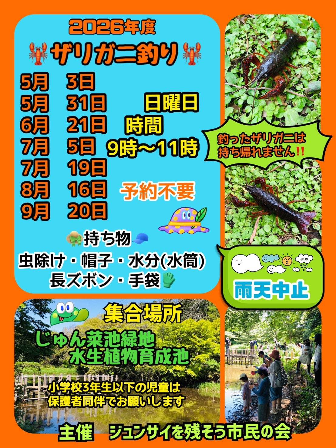 ※虫に刺されないように虫よけ・長ズボンがあると便利です。ザリガニに触るとき軍手など手袋があると安心です。