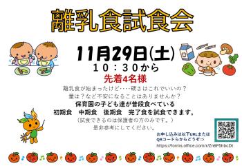 こどもの健全育成公開日:2025年11月13日地域交流「離乳食試食会」のお知らせ開催日:2025年11月29日(土)